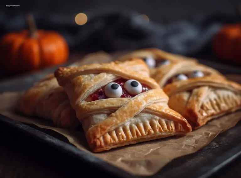 Spooky and delicious, these Mummy Cherry Pies are perfect for Halloween! Flaky pastry strips wrap around a sweet cherry filling, creating adorable little mummies.