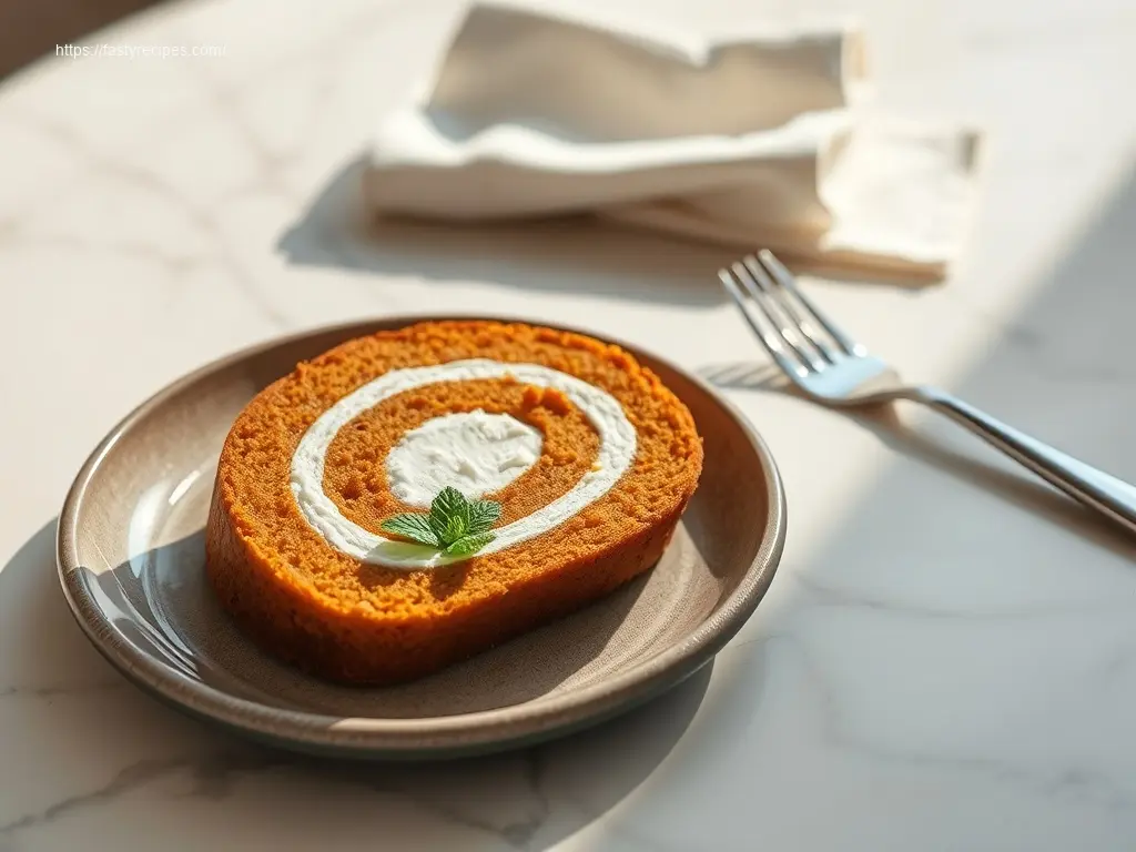 A delightful dessert featuring a spiced pumpkin cake rolled with a rich and creamy cream cheese filling, perfect for holidays or any special occasion.